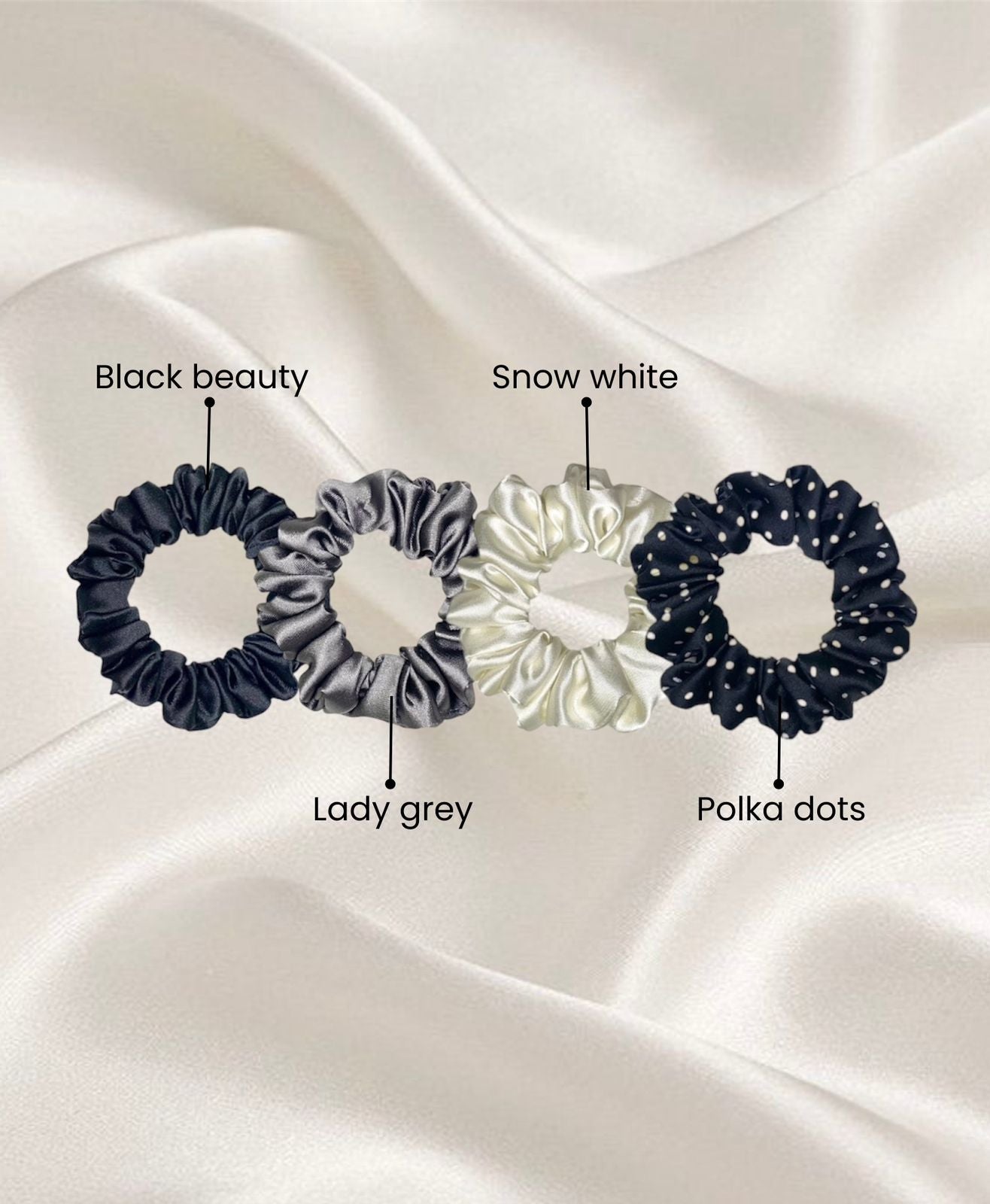 The BASICS MINI Set is made out of premium quality satin silk, this scrunchie isn't just beautiful, it's designed to be gentle on your hair and provide you with all the goodness a regular hair elastic fails to give you. These unlike regular ones will not cause dents or crease your hair. Say goodbye to hair breakage and invest in your hair.