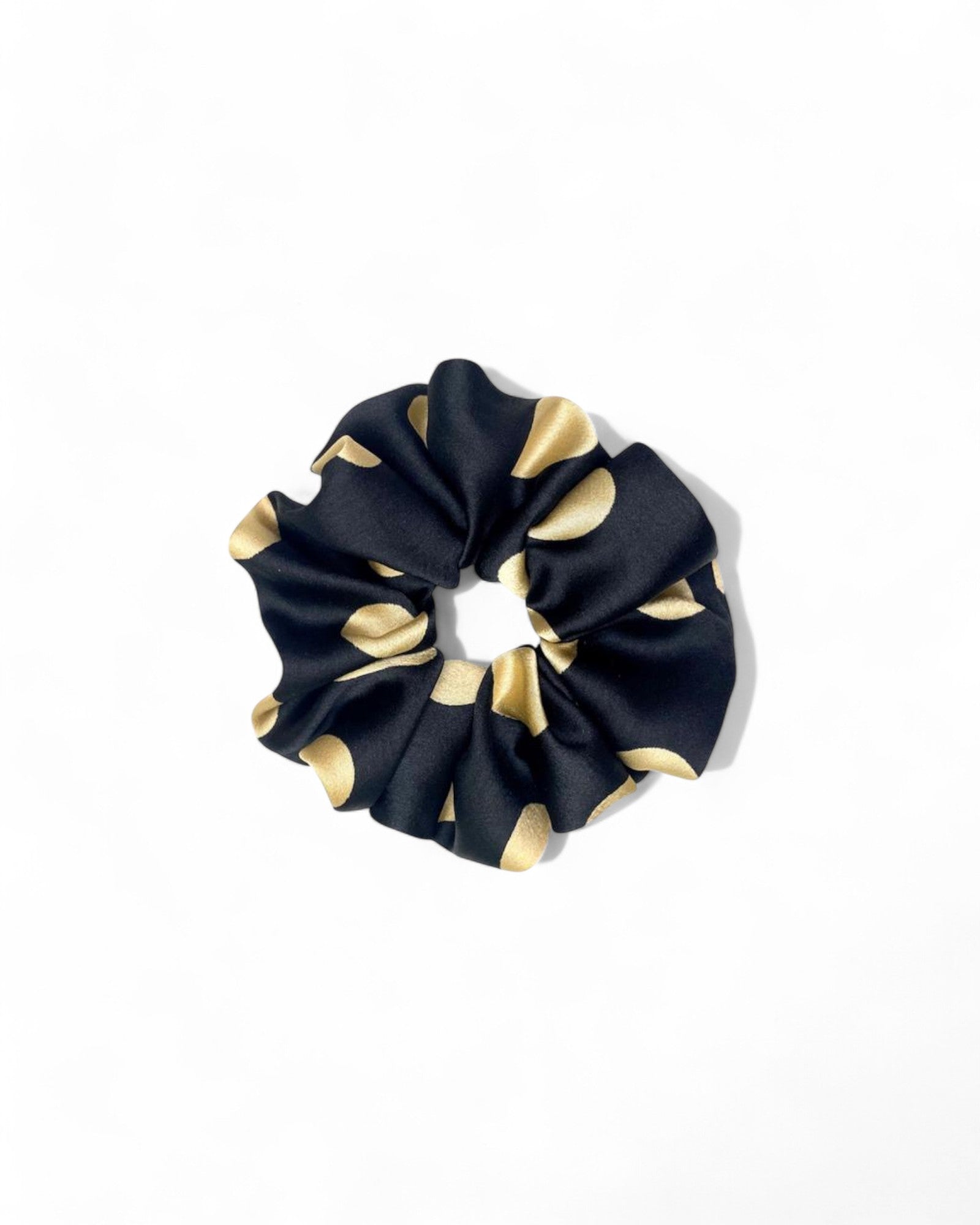 An effortlessly beautiful hair accessory with a black base adorned with gold polka dots. Whether you're heading to a special event or adding flair to your everyday look, this scrunchie is the ideal choice. The timeless color combination makes it a versatile addition to your accessory collection. Make a statement with every hairstyle – because elegance is in the details.